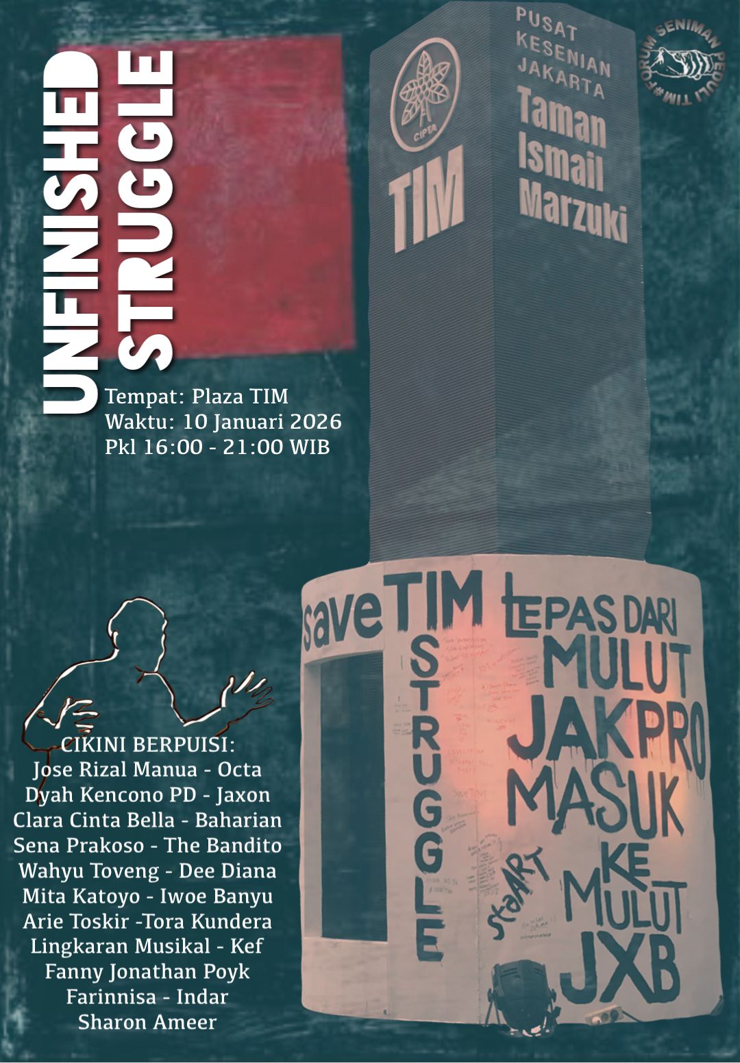 JAKARTA – Awal Januari 2026 gerakan #saveTIM kembali menggema. Willy Fwi dan Ical Vrigar mengajak kawan-kawan seniman untuk aksi #saveTIM kembali pada 3 Januari 2026, dan dilanjutkan dengan aksi kedua ditahun awal 2026 ini pada 10 Januari, dengan tagline UNFINISHED STRUGGLE.